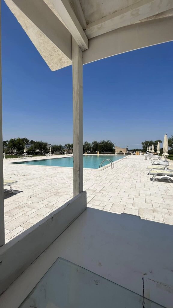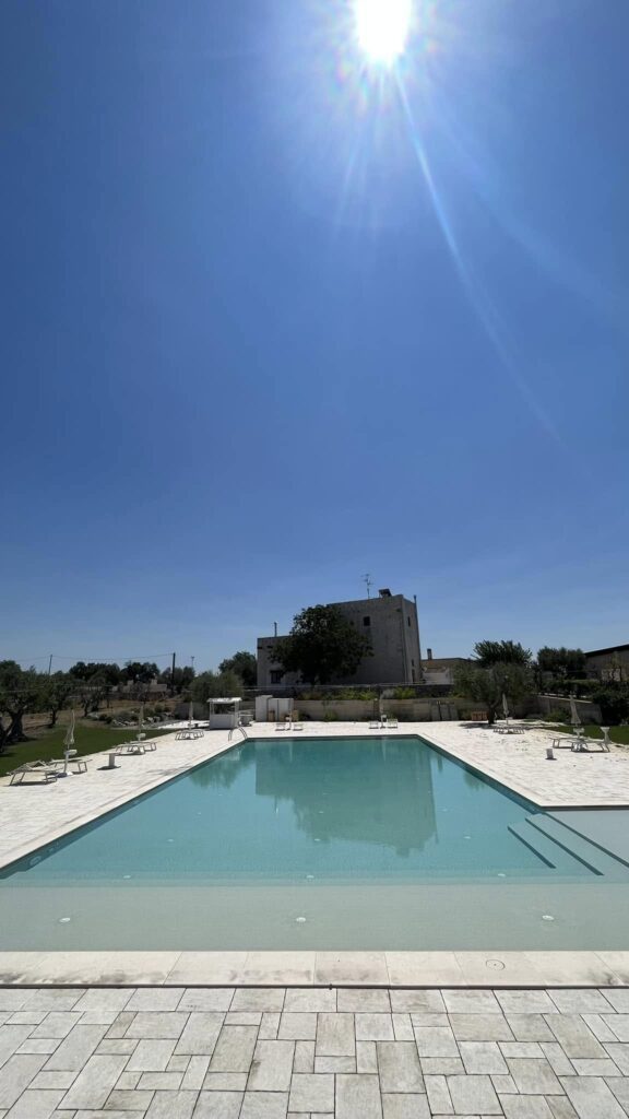 La piscina cristallina, incastonata nella quiete della campagna pugliese, è riservata esclusivamente agli ospiti della struttura. Circondata da ulivi, muretti a secco e silenzi pieni di luce, rappresenta il cuore dell’esperienza di soggiorno a Masseria Stella: un luogo dove rilassarsi davvero, leggere un libro all’ombra o semplicemente lasciarsi cullare dal sole.